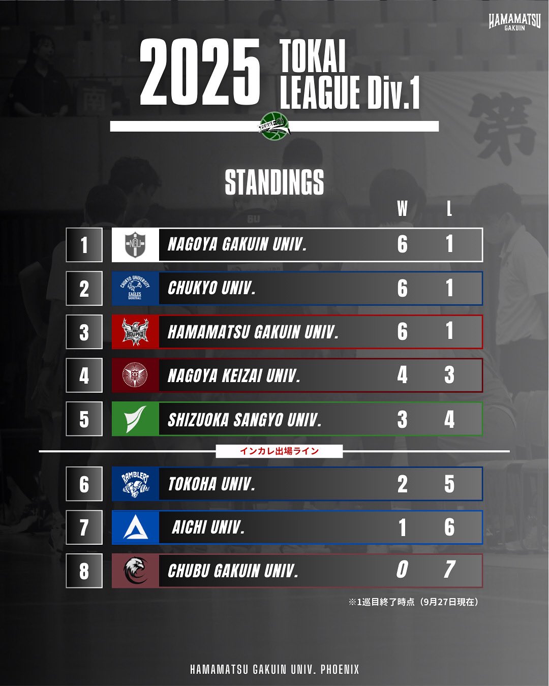 第96回東海学生バスケットボールリーグ戦 1部リーグ順位表
